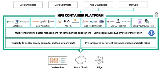 HPE는 최근 인수한 블루데이타(BlueData)와 맵알(MapR)이 보유한 검증된 기술을 결합시켜 HPE 컨테이너 플랫폼을 완성시켰다. HPE 컨테이너 플랫폼은 블루데이타의 소프트웨어인 컨테이너 관리 컨트롤 플레인(Container Management Control Plane)과 MapR의 분산파일 시스템을 퍼시스턴트 스토리지를 위한 통합 데이터 패브릭 소프트웨어를 통합하여 하나의 솔루션으로 제공한다.