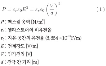 전극 사이에 생기는 압력은 식(1)에 의해 나타냈다. 엘라스토머에 300%의 전치왜곡을 가한 아크릴성의 고무 재료를 사용한 경우, 2kV의 전압으로 약 133%의 면적 변형이 생긴다.