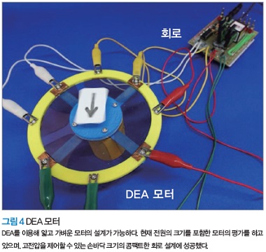 필자 등은 기존 연구를 참고로 DEA Motor를 개발했다(그림 4). DEA Motor의 구동에는 4개의 DEA에 위상차 명령을 주고 변형시킬 필요가 있다. 따라서 고전압을 여러 개의 포트에서 출력하는 회로가 필요했다. 필자 등은 시판의 승압장치와 고전압 스위칭 소자를 이용해 손바닥 크기의 콤팩트한 회로를 설계했다.