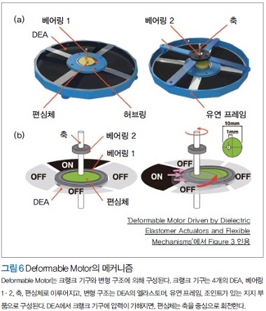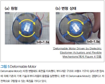 부드럽게 변형 가능한 모터의 실현을 위해서는 굴곡 시에 모터의 단면이 타원 변형해도 내부 구조가 유지되고 회전을 계속하는 구조가 필요하다. 필자 등은 외력에 의해 변형되어도 계속 회전하는 Deformable Motor를 개발했다. 그림 5(a)는 Deformable Motor의 원형, 그림 5(b)는 변형 상태를 나타낸다. 회전 시의 각 DEA의 동작은 고속 편광 카메라를 이용한 응력 가시화 실험에 의해 확인하고 있다.