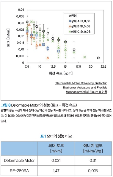 Deformable Motor의 회전 성능은 원형이 가장 높은 회전 성능을 나타냈다. 그 최대 토크는 0.031mNm, 최대 회전 속도는 21.4rpm이었다. 또한 변형 상태에서는 높은 성능 순으로, 상태 C→상태 A→상태 B였다. 성능 차이의 원인은 변형에 의해 엘라스토머의 전치왜곡이 변화했기 때문이다. 전치왜곡이 불충분해진 DEA는 역학적으로 불안정해지고, 신축량이 감소했다고 생각된다. 신축률이 낮은 DEA가 이웃하는 상태 B는 가장 낮은 성능이다. 예비 실험에서는 상태 C의 대변형 시(변형 왜곡 Г=0.15)에 모터가 회전하는 것을 확인했다.