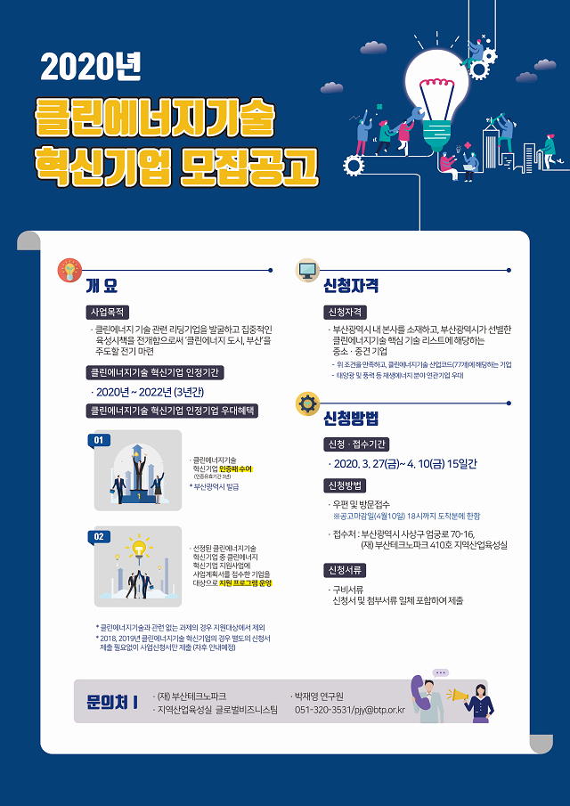 공모는 태양광, 풍력, 바이오, 수소·연료전지 등 부산지역 신재생 클린에너지 분야 중소기업을 대상으로 하며, 20개사 내외의 기업을 선발할 계획이다.
