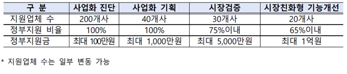 기술사업화 진단 및 사업화 기획에 소요되는 비용은 정부에서 전액 지원하며 시장검증의 경우 사업비의 75% 이내에서 최대 5,000만 원까지 지원받을 수 있다. 시장친화형기능개선은 사업비의 65% 이내에서 최대 1억 원까지 지원한다.