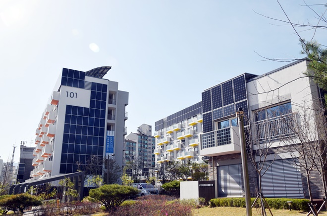 태양광 패널이 건물 외관에 어우러져 있는 아파트 단지. 이지하우스입니다.
