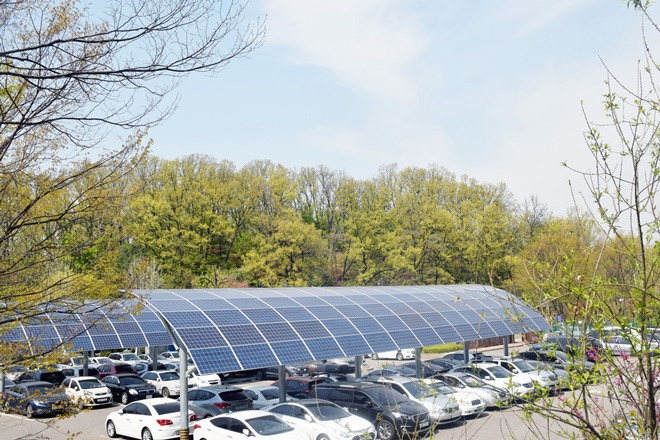 ▲ 서울연구원 주차장은 태양광 패널로 지붕을 만들어 친환경에너지를 생산하고 있다.
