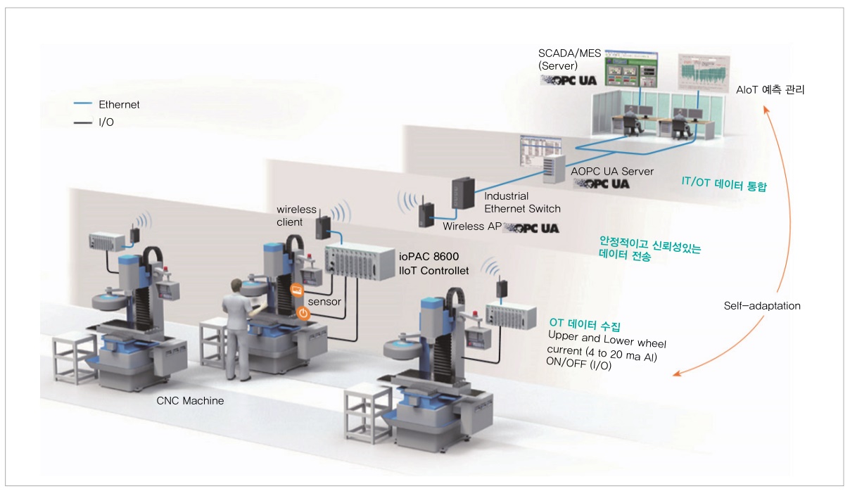 • 상부 및 하부 휠 전류값(4~20mA, 아나로그 입력)과 O n / O f f 상태 입력값(디지털 입력)과 같은 OT(Operational Technology) 데이터를 수집하는 IIoT 컨트롤러 • 데이터의 신뢰성과 투명성을 보장하는 산업용 이더넷 스위치 및 무선 엑세스 포인트(Wireless AP) • IT-OT 데이터 통합을 위한 AOPC UA 서버