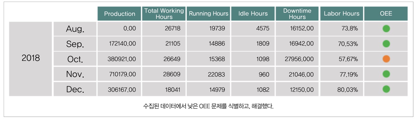 솔루션 적용 이후, 새로 수집된 데이터를 통해 생산 관리 자가 하루의 가동시간과 튜닝, 유휴 및 가동중단 시간을 보다 명확하게 파악할 수 있게 되었으며, 이를 통해 야간 근무시간의 OEE를 실시간으로 개선할 수 있었다. 또한 상위 관리자들도 주별 및 월별 진행상황을 주기적으로 추적할 수 있게 되었다.