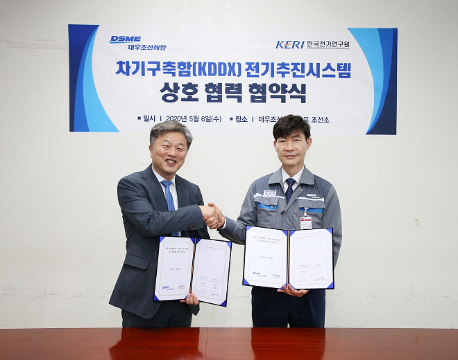 KERI와 대우조선해양은 지난 6일, 차기구축함(KDDX) 등 차세대 첨단 함정에 전기추진체계 기술을 적용하기 위한 공동연구에 합의하고 양해각서를 체결했다고 밝혔다.
