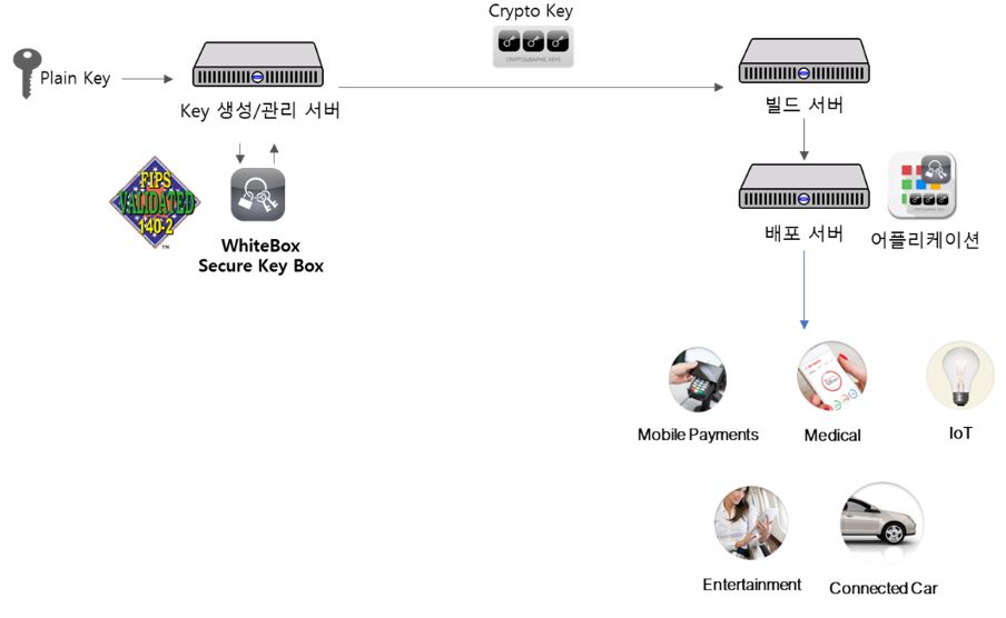 화이트크립션 시큐어 키 박스는 보안 하드웨어가 필요 없는 소프트웨어 방식으로, 특허 받은 강력한 수학적 코드 변환을 기반으로 항상 암호화 키를 숨기는 자체 화이트박스 암호화 방식을 적용한다. 특정 하드웨어에 구애를 받지 않기 때문에 활용도가 높으며, 웹 서비스에 대한 키 보안 기능을 제공하고 있어 오픈 플랫폼에서의 안전한 서비스 설계를 지원한다.