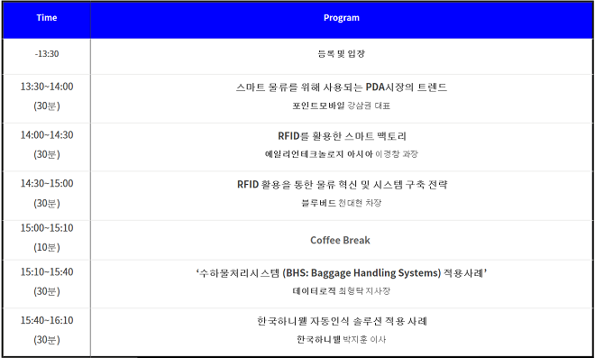 이번 세미나에는 에일리언테크놀로지, 한국하니웰, 데이터로직, 블루버드, 포인트모바일 등의 기업이 참가해 ▲스마트 물류를 위해 사용되는 PDA시장의 트렌드 ▲RFID 활용을 통한 물류 혁신 및 시스템 구축전략 ▲수하물처리시스템(BHS: Baggage Handling Systems) 적용사례 등 각 기술과 적용사례 등을 소개할 예정이다.