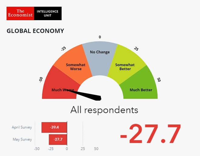 전 세계 경영진들은 평균 -27.7점의 수치로 향후 3개월 간 세계 전망에 대해 여전히 부정적인 입장을 보였다.