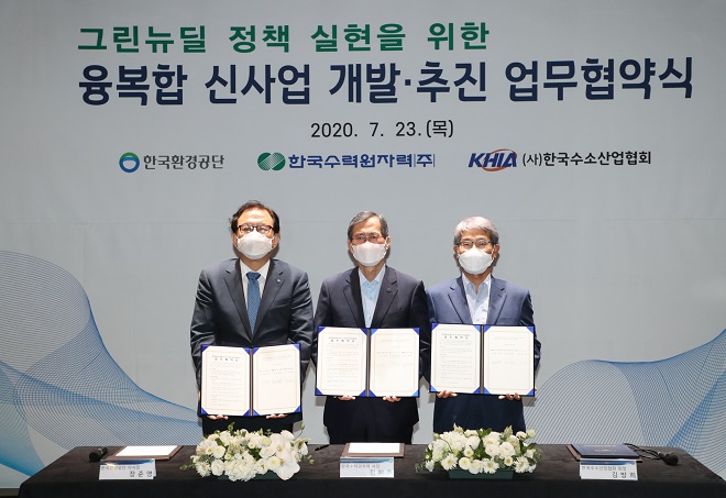 한국수력원자력(사장 정재훈, 이하 한수원)이 23일 서울 메리어트호텔에서 환경부 산하 한국환경공단(이사장 장준영), (사)한국수소산업협회(회장 김방희)와 그린뉴딜 실현을 위한 ‘융복합 신사업 공동협력 업무협약(MOU)’을 체결했다.