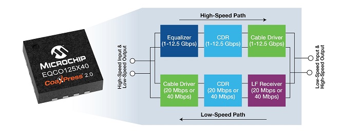 마이크로칩의 EQCO125X40 family of CoaXPress 디바이스 제품군은 새 사양을 바탕으로 하는 새로운 하위 호환 설계부터 시작해 CXP 2.0 표준을 최초로 구현했다.