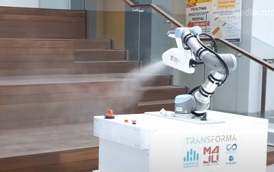 싱가포르 난양기술대학교 연구진은 XDBOT(eXtremeDisinfection roBOT)이라는 자동화 방역 로봇을 공개했다. XDBOT은 글로벌 협동로봇 브랜드인 유니버설 로봇의 UR5를 이동형 플랫폼에 설치하고, 소독제 분사를 위한 정선기 스프레이 노즐을 장착했다. UR5 협동로봇은 어떤 이동형 플랫폼에도 설치가 가능해 장소에 구애 받지 않고 로봇에 의한 방역 작업이 가능하다.