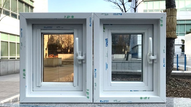 ▲KETI가 개발한 LSC가 적용된 창호형 투명 태양전지(좌)와 일반창호(우)