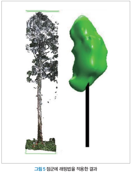 필자는 수목의 수관부만을 래핑법에 의해 에워싸는 표면의 작성에 성공했다(그림 5). 컴퓨터그래픽 기술을 응용해 개발한 기술이며, 래핑법에 의해 지금까지 불가능했던 부정형 수관 구조를 점군으로부터 상세하게 파악할 수 있다. 동시에 에워싼 장소의 ‘체적’을 정확하게 산출할 수 있다. 이 기법은 당초 항공기 레이저에 대해 개발됐지만, 고밀도로 취득되는 지상 레이저에서도 적용 가능하다. 레이저에 의해 취득된 3차원 점 데이터로부터 자동으로 형상을 파악할 수 있는 해석 기술은 세계적으로 높게 평가받고 있다.
