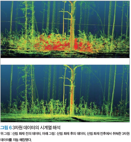 지상 레이저에 의해 재해 전후에 데이터를 취득, 두 시기의 3차원 데이터를 자동으로 매칭해 산림 화재 전후의 변화를 정확하게 비교할 수 있게 했다(그림 6). 그 결과, 피해도는 육안이 아니라 양으로 산출할 수 있게 됐다.