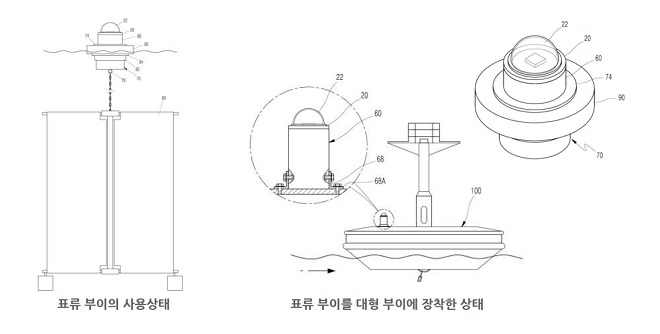 ▲ 표류부이 사용상태(왼쪽)와 표류부이를 대형 부이에 장착한 상태(오른쪽)의 모습.