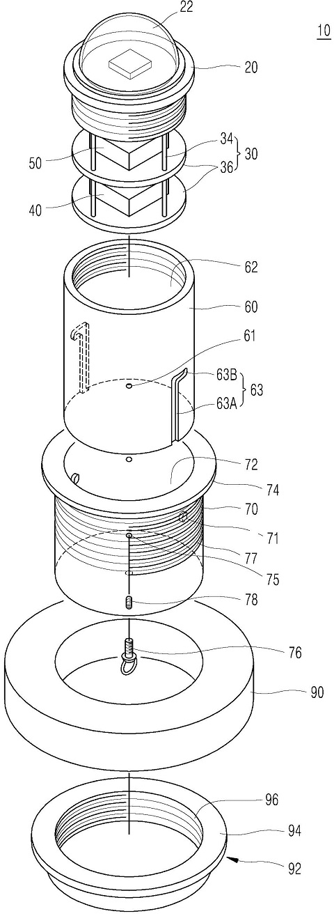 이 보호 하우징에는 끼움 결합된 상기 부력체를 상기 플랜지에 밀착시켜 고정하기 위한 부력체 고정부재가 환형의 가압단을 구비해 중공형으로 형성할 수 있다.