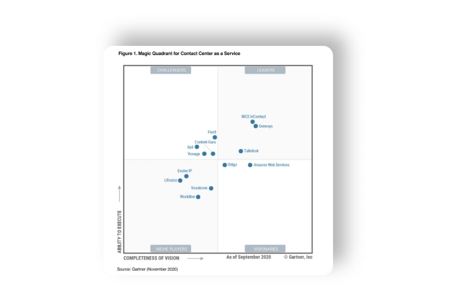 제네시스가 2020 가트너 매직 쿼드런트 서비스형 컨택센터 부문 리더 기업에 선정됐다고 발표했다. 제네시스는 비전 완성도 부문에서 최고의 평가를 받았다.