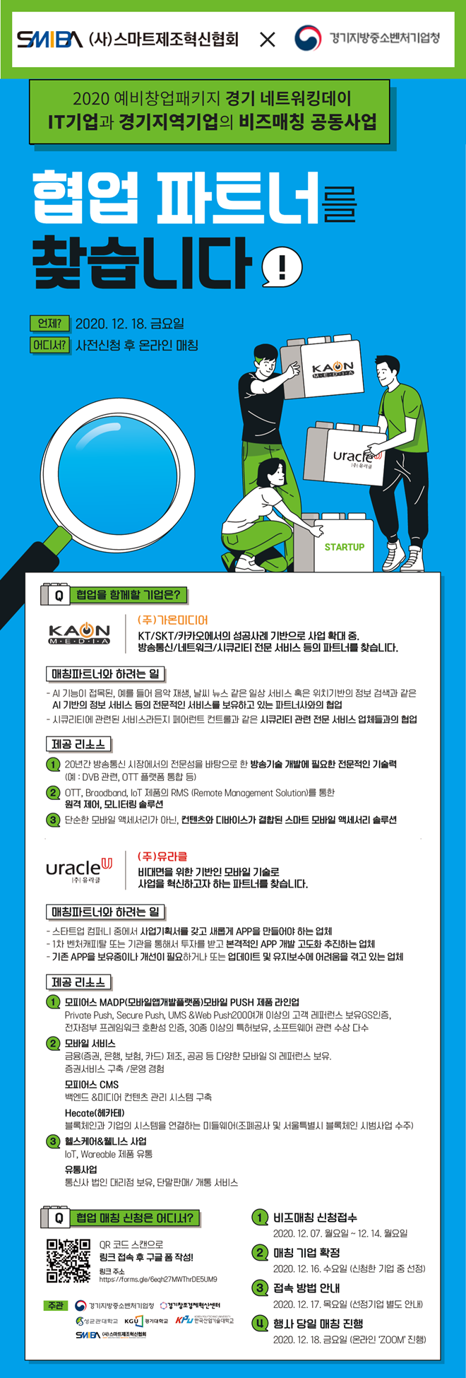 경기지방중소벤처기업청과 공동으로 주최한 ‘2020 예비창업패키지 경기 네트워킹 데이’ 행사의 일환으로, 스마트제조혁신협회가 ‘IT기업과 경기지역기업의 비즈매칭 공동사업’에 참여할 기업을 모집한다.
