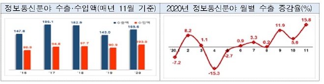 과학기술정보통신부(이하 과기정통부)가 11월 정보통신기술(ICT) 수출액이 165.6억 달러, 수입액이 103.8억 달러, 무역수지는 61.8억 달러 흑자로 잠정 집계됐다고 15일 발표했다.