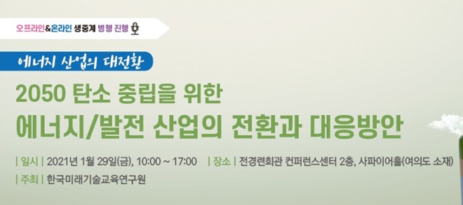 한국미래기술교육연구원이 내달 29일 '에너지 산업의 대전환, 2050 탄소중립을 위한 에너지, 발전 산업의 전환과 대응방안 세미나'를 여의도 전경련회관에서 개최한다.