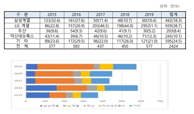 국내기업의 최근 5년간 출원 건수를 살펴보면, LG 계열사가 939건으로 가장 많은 특허를 출원한 것으로 나타났다. 이어서 삼성계열 442건, 덕산 네오룩스 245건, 두산 203건 등 순이다.