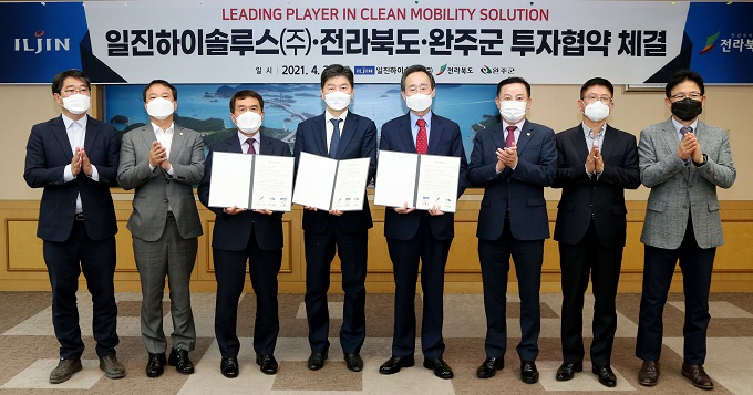 수소 자동차용 수소연료저장 솔루션 전문기업 일진하이솔루스(전 일진복합소재)는 23일 전라북도, 완주군과 연구센터 및 제조공장 설립을 위한 투자협약(MOU)을 체결했다고 밝혔다.