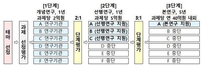 1단계 개념연구는 1년간 2억원, 2단계 선행연구는 1년간 5억원, 3단계 본연구는 5년간 연 40억원 내외 등 과제당 최장 7년, 최대 207억원 내외를 지원할 계획이다.