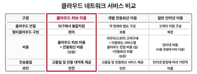 SKT는 지난 1월 AWS, MS 등 국내외 클라우드 사업자(CSP)들과 체결한 전략적 제휴를 바탕으로 ‘클라우드 허브’와 전용회선 서비스를 제공해 멀티 클라우드를 이용하는 기업들에게 편의성과 안정성은 물론 비용 절감까지 가능하도록 할 방침이다.