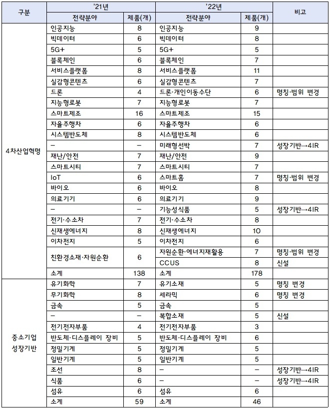 올해는 기업인, 일반 국민, 전문가 등의 수요조사와 이를 통해 발굴된 제품·기술에 대한 기술성, 시장성 평가 등을 거쳐 총 32개 분야, 224개 품목을 전략 제품으로 선정했다.