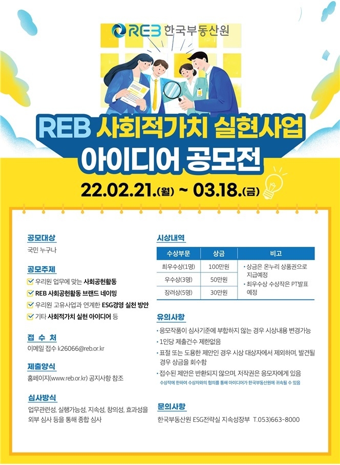 한국부동산원은 2월 21일부터 3월18일까지 ‘REB 사회적가치 실현사업 아이디어 공모전’을 개최한다고 밝혔다.