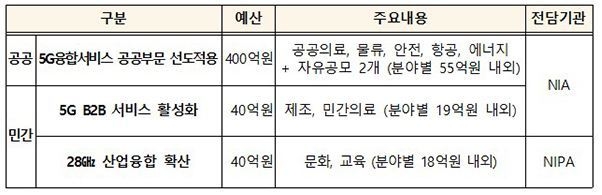이 중 7개 과제에 400억을 투입하는 공공부문 실증사업은 의료·물류·에너지 등 분야에서 5G 융합서비스를 적용해 디지털 전환을 촉진하기 위해 추진한다.
