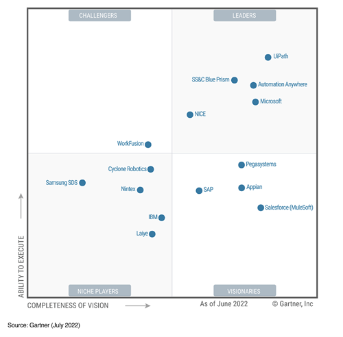 특히 RPA 시장에서 리더들은 기업 고객의 니즈를 이해하고 핵심 RPA 제품의 기능 확장과 신규 제품 및 서비스 확대의 기회를 빠르게 파악한다. 즉, 리더는 시장을 선도하는 비전와 그 비전을 실행할 수 있는 역량을 보유하고 있다.