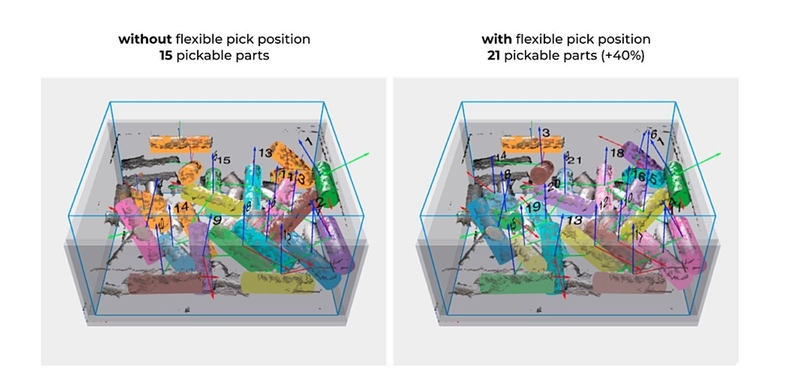 이미 높은 선택 가능성 비율을 어떻게 높일 수 있을까. 유연한 선택 방향을 사용해 일부 픽은 픽킹 성공을 저해하지 않으면서 방향을 따라 위치 변동을 허용한다. 픽잇 소프트웨어는 이 유연한 선택 위치를 지정할 수 있도록 하며, 항목 선택 방법을 선택할 때 이를 활용한다. 아래 그림을 살펴보면, 선택 가능한 부품이 40% 증가한 경우를 알 수 있다. 이는 최소한의 노력으로 높은 선택 가능성 이점을 누릴 수 있음을 의미한다.