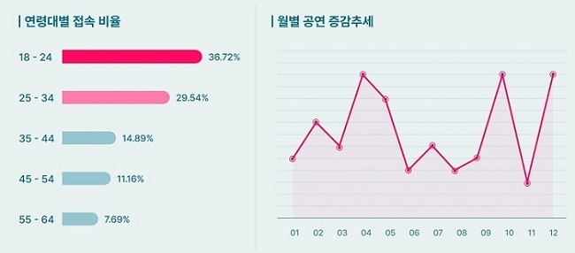 온라인 공연을 시청하는 연령대 통계에서는 18~24대가 가장 높은 소비를 이루고 있어서 아이돌 팬덤의 영향을 크게 받는 것으로 나타났으며 이후 세대별로 단계별 점유를 차지하고 있다. 성별 역시 여성 69%, 남성 31%로 여성 팬층의 소비력은 오프라인 공연과 비슷한 수준으로 높은 것으로 분석했다.