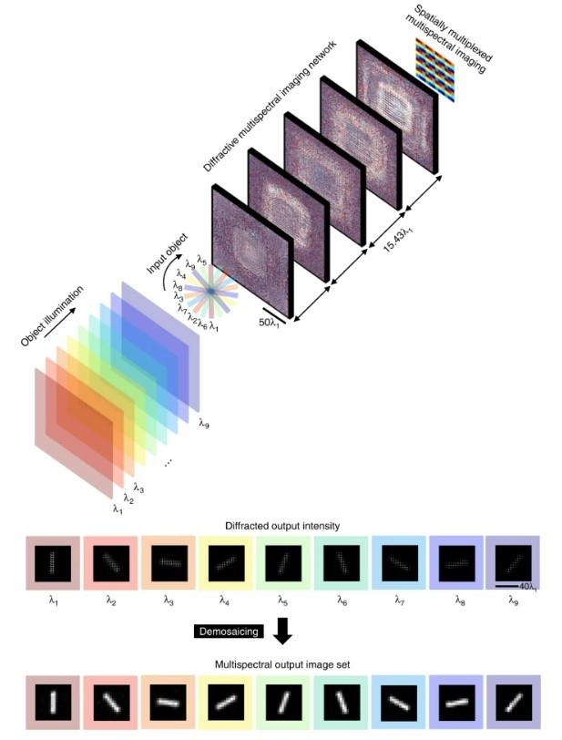 UCLA의 과학자들이 개발한 새로운 스냅샷 다중 스펙트럼 이미저는 흡수 필터 대신 회절 광학 네트워크에 의존한다. 출력 이미지 시야에서 주기적으로 반복되는 16개의 고유 스펙트럼 대역으로 구성되어 가상 다중 스펙트럼 픽셀 배열을 형성한다.