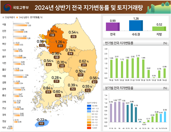 국토교통부와 한국부동산원은 2024년 상반기 지가 변동률 및 토지 거래량을 발표하였다. '24년 상반기 전국 지가는 0.99% 상승하였다.