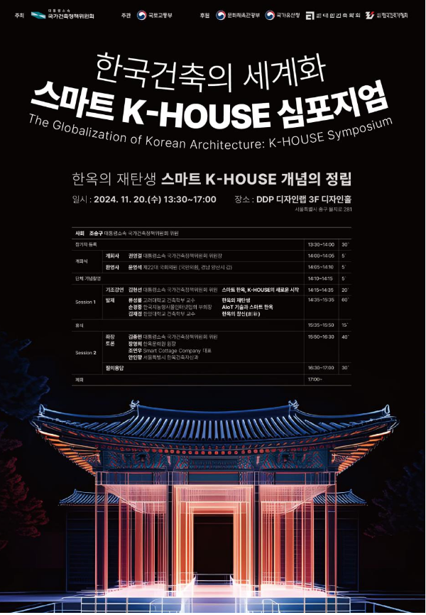 국가건축정책위원회(위원장 권영걸)는 국토교통부(장관 박상우)와 함께 11월 20일(수) 오후 2시 동대문디자인플라자 디자인 홀(서울 중구)에서 ‘케이(K)-건축의 세계화: 스마트 케이(K)-하우스(HOUSE) 심포지엄’을 개최한다고 밝혔다.