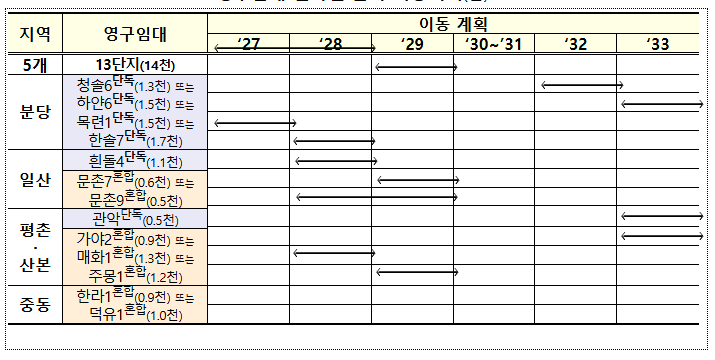 국토교통부는 1기 신도시 영구임대주택 재건축 사업의 원활한 추진을 위해 신도시별로 국토부, 지자체, LH가 참여하는 전담 조직(TF)을 구성하고, 이주 지원 등 다양한 지원 방안을 마련할 계획이라고 밝혔다. 신도시별 TF팀은 재건축 사업의 효율적인 추진을 지원하고, 주민 불편을 최소화하려는 방안이다. 실행 방안으로 이사 비용 지원 등 이주 지원을 강화 하여 임시 거처를 제공하고 이주 과정에서 발생할 수 있는 어려움을 해소하기 위한 다양한 지원 방안을 마련한다. 이같이 추가 공급되는 물량은 1기 신도시 정비 사업의 중장기적인 주택 수급 변화에 대응하여 주택 시장 안정화에 이바지할 것으로 기대된다.