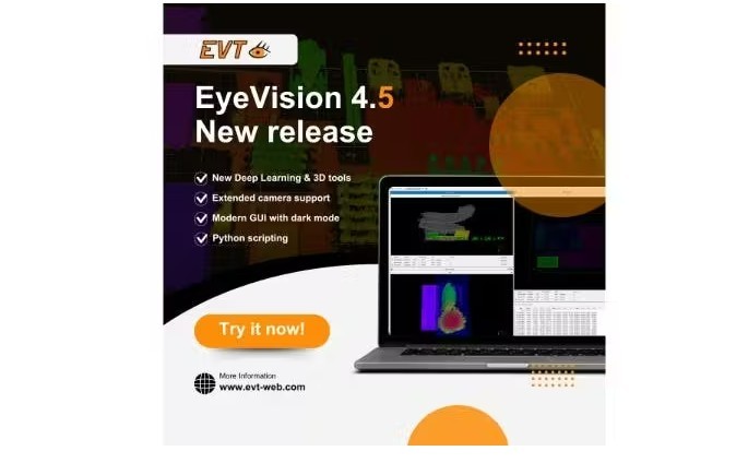 EVT는 최근 자사의 이미지 처리 소프트웨어 EyeVision의 최신 버전인 EyeVision 4.5를 출시했다. 이번 최신 버전에는 선택적 Python 스크립팅과 향상된 딥 러닝 및 3D 도구 등 새로운 기능이 추가되었다. 예를 들어, 딥 러닝 모듈은 3D 환경에서도 향상된 이미지 분할, 물체 탐지 및 이상 탐지 기능을 제공한다. 또한 이 소프트웨어는 구멍 검출, 3D 윤곽 추적, 다중 높이 측정을 위한 새로운 3D 도구를 추가했다. EyeVision 4.5는 RVBust, SENGOIC, Hefei-ITEK, The Imaging Source, Precitec, Micro-Epsilon, NextVision용 새 드라이버와 NXO 또는 NVIDIA 하드웨어를 지원하는 스마트 카메라 지원도 추가했다.