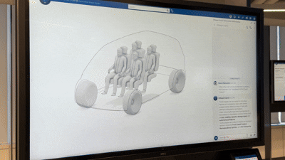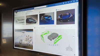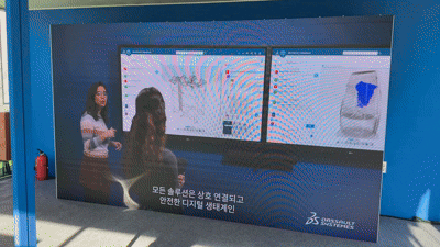 제조 생애 주기 존은 자동차 한 대가 디자인에서 출발해 상세 설계, 로직 설계, 해석, 생산, 마케팅으로 이어지는 여섯 단계를 순서대로 따라가는 구성이다. 각 단계에서 나오는 ▲3D 모델 ▲부품 정보 ▲해석 결과 ▲공정 조건 ▲마케팅 자산을 하나의 3D익스피리언스에 적용한 지점을 보여준다. 또한 설계 변경이 생산 시뮬레이션과 고객 경험 화면까지 동시에 반영되는 흐름도 구현된다.
