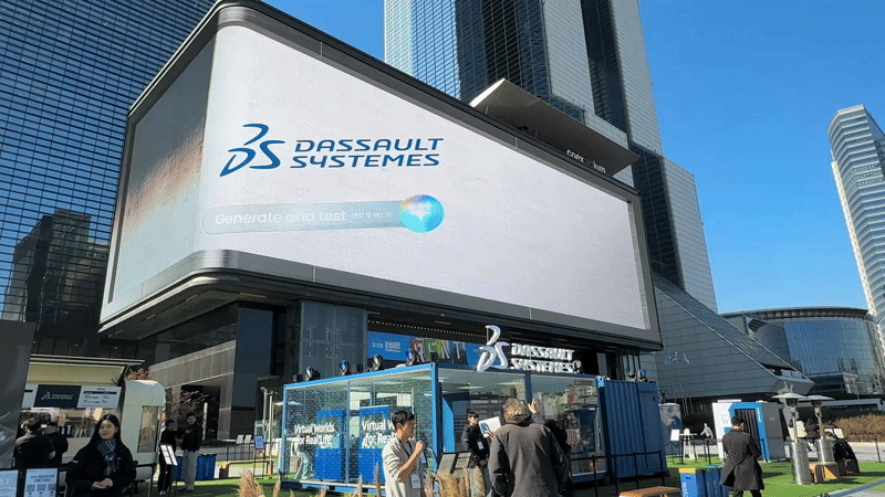 이 자리에서는 회사의 3D 모델링 및 시뮬레이션 방법론 ‘버추얼 트윈(Virtual Twin)’과 이를 기반으로 한 ‘3D익스피리언스(3DEXPERIENCE)’ 플랫폼이 다뤄졌다. 광장에 컨테이너 부스를 설치하고, 대형 옥외 LED 디지털 전광판(Signage)에는 자동차 생산 라인과 버추얼 트윈 영상이 재생됐다.