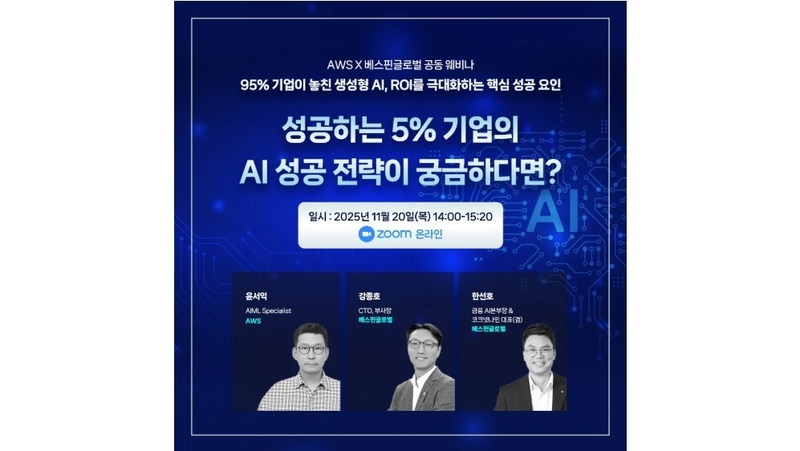 베스핀글로벌은 오는 20일 기업의 성공적인 AI 도입 전략 수립을 지원하기 위한 온라인 세미나 “95% 기업이 놓친 생성형 AI, ROI를 극대화하는 핵심 성공 요인”을 개최한다. 이번 세미나는 한국 AI 시장 트렌드와 실제 산업 현장에서의 AI 혁신 사례 및 ROI 개선 전략을 중심으로 진행된다.