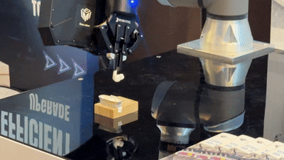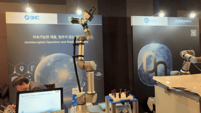 다양한 현장에서 핵심 공정인 픽앤플레이스는 여러 파트너가 나눠 맡았다. UR 코봇 모델 ‘UR15’는 고속 반복 동작으로 표준 부품을 집어 옮기는 작업을 담당했고, 임팩트(IMPAQT)와 SMC는 형상과 크기가 다른 부품을 자사 엔드이펙터(End-effector)로 집어 지정 위치에 놓는 구성을 시연했다.