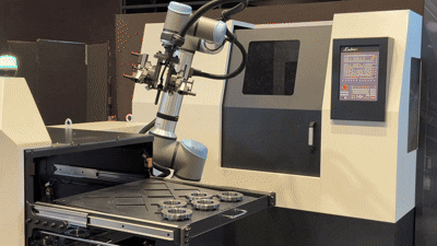 영창로보테크(Youngchang Robotech)는 공작기계 전면에서 도어 개방, 부품 투입·배출을 UR 코봇으로 수행하는 머신 텐딩 솔루션을 선보였다. 자재 이송과 장비 전면 작업을 코봇과 머신 텐딩 장비가 맡는 구조를 강조한 지점이다.