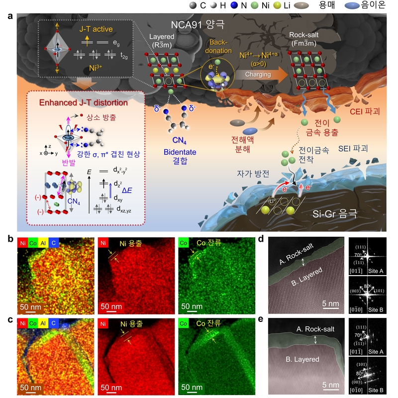니트릴 구조는 금속 이온과 결합력이 높은 형태로, 이 강한 결합 때문에 양극 표면에 형성돼야 하는 보호막 역할의 전기이중층(EDL)이 붕괴된다. 이 과정에서 충·방전 중 양극 구조가 뒤틀리는 얀-텔러 왜곡(Jahn-Teller distortion)이 발생하고, 양극 전자가 CN4로 이동해 양극이 빠르게 손상된다.