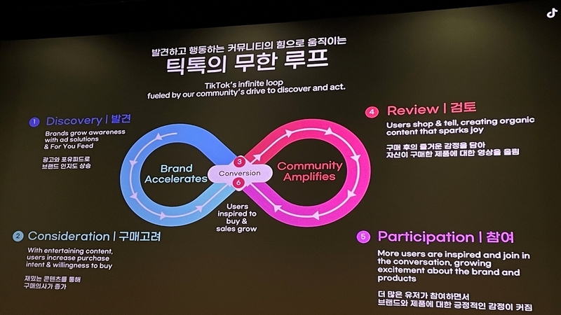 마지막 세션에서는 매티 린 틱톡코리아 글로벌 비즈니스 솔루션 제너럴 매니저가 틱톡을 통한 국내 브랜드의 글로벌 성장 전략을 설명했다. 매티 린 제너럴 매니저는 틱톡이 콘텐츠와 커머스를 연결하는 ‘무한 루프’ 구조를 통해 제품 발견부터 구매, 확산까지 이어지는 차별화된 경험을 제공한다고 밝혔다. 그는 크리에이터 협업과 캠페인을 지원하는 ‘틱톡 원(TikTok One)’과 AI 기반 크리에이티브 툴 ‘틱톡 심포니(TikTok Symphony)’를 주요 성장 도구로 소개했다. 미국과 동남아 시장을 중심으로 운영 중인 틱톡샵과 크로스보더 솔루션을 통해 국내 기업의 글로벌 진출을 지원해 왔다는 점도 언급했다.