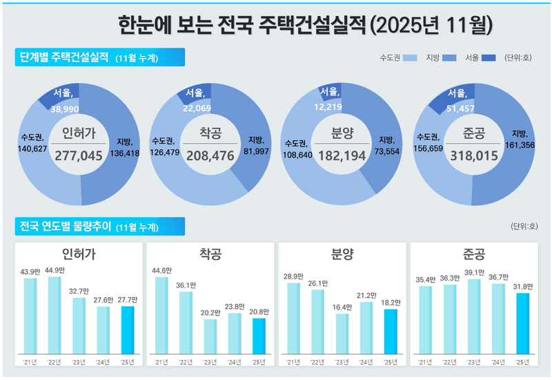 국토교통부(장관 김윤덕)는 2025년 11월 기준 주택 통계를 30일 공표했다. 통계에 따르면 수도권을 중심으로 인허가와 착공은 증가세를 보였으나, 비수도권과 분양·준공 실적은 전반적으로 감소하며 지역 간·지표 간 온도차가 나타났다.